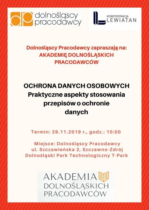 Nasz partner SKANIA MDS wspólnie ze związkiem pracodawców Dolnośląscy Pracodawcy serdecznie zapraszają na szkolenie, które odbędzie się w dniu 29 listopada br. Tematyką szkolenia będą porady praktyczne z ochrony danych osobowych oraz praktycznych aspektów stosowania przepisów o ochronie danych osobowych w przedsiębiorstwie. Akademia Dolnośląskich Pracodawców odbędzie się w siedzibie Dolnośląskich Pracodawców: ul. Szczawieńska 2, 58-310 Szczawno-Zdrój. Szkolenie poprowadzą nasi specjaliści: Joanna Arendarska z kancelarii TSL Lawyers Strachowicz i Wspólnicy sp. k. - www.tsllawyers.eu oraz Sebastian Kania ze SKANIA MDS - www.skania.pl